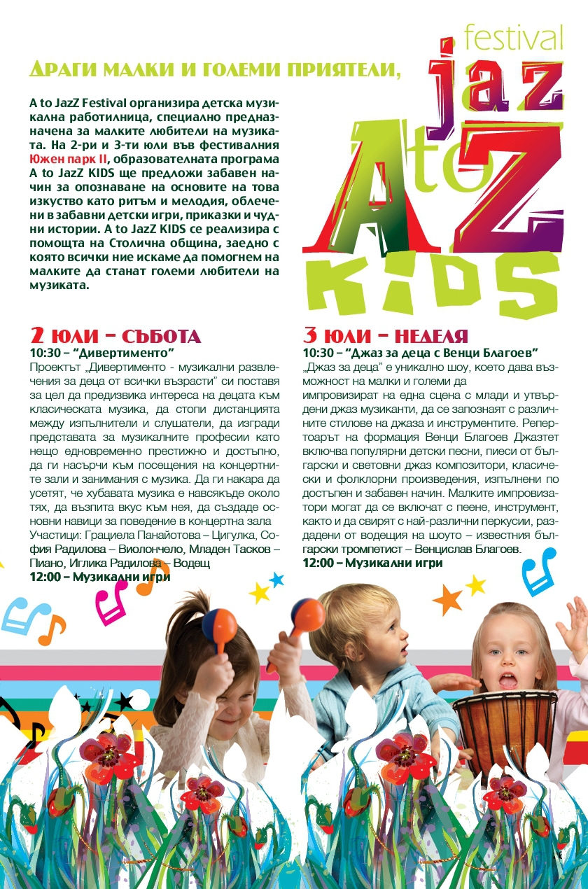 След по-малко от месец София отново е домакин на фестивала A to JazZ, където освен забележителна селекция от изпълнители, които излизат на сцената в Южен парк 2, организаторите, с подкрепата на Столичната община, са подготвили и детска програма, предназначена за най-малките меломани.