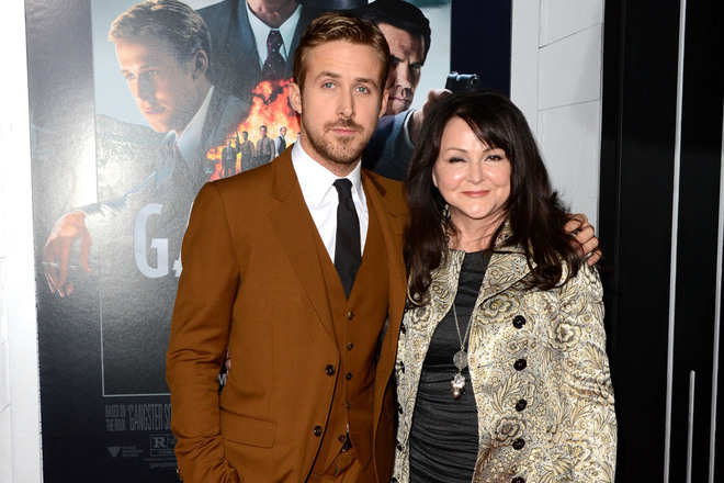 Райън Гослинг с майка си на премиерата на "Гангстерски отдел" в Холивуд, 7 януари 2013 г. Приятелката му Ева Мендес не беше с тях, но стана ясно, че родителката му носи нейните тоалети. Облечена съм в "Ева Мендес", похвали се Дона Гослинг