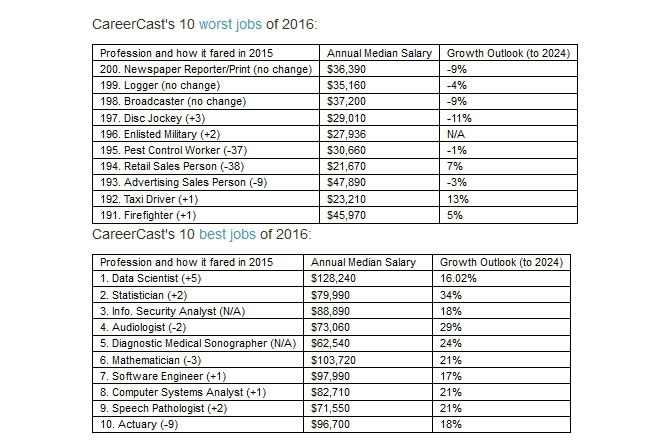 На върха в списъка с най-перспективни професии се изкачват специалности, свързани с математиката - анализатор на данни (data scientist) и статистик анализатор, които заемат първите две места, математик (номер 6) и актюер (10).