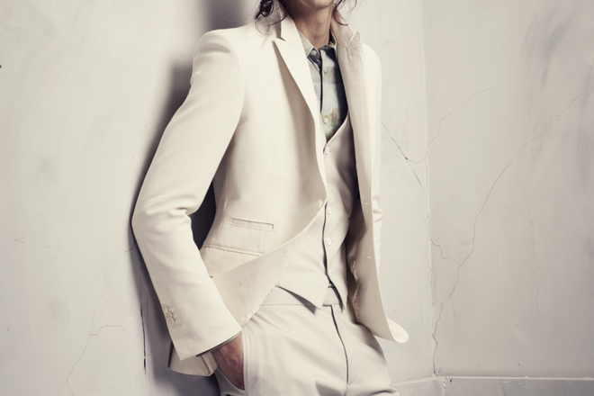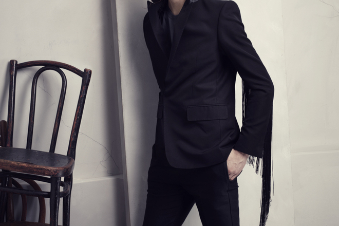 Много важно място заемат детайлите – старомодните тиранти с копчета, съчетани с бял панталон, който е част от бял костюм тройка, или принтът на рози, който може да се види на подплатата на смокинга.