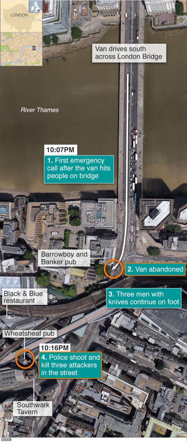 Би Би Си показва на сателитна карта от района как се е разгърнало нападението в съботната вечер на 3 юни