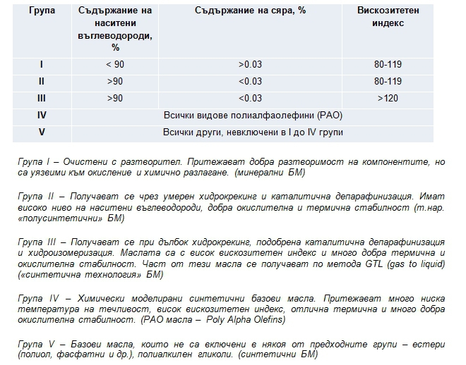 Това, което трябва да знаете днес за базовите масла (БМ), е, че те се делят на пет основни групи: