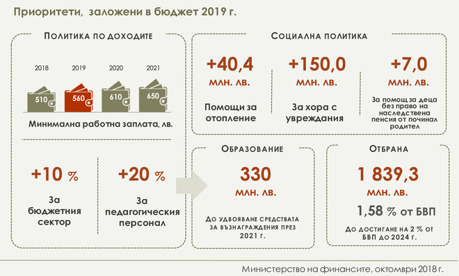 Приоритети в проектобюджет 2019 са социалната политика, образованието, отбраната, политиката по доходите - и по-справедливи субсидии за общините, изтъкват от Министерството на финансите.