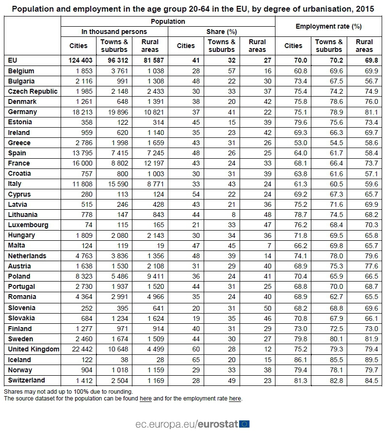 По показатела население и заетост във възраст 20-64 според степента на урбанизация данните за България сочат 73,4% заетост в големите градове, 67,5% в по-малките градове и 56,7% в селските райони.