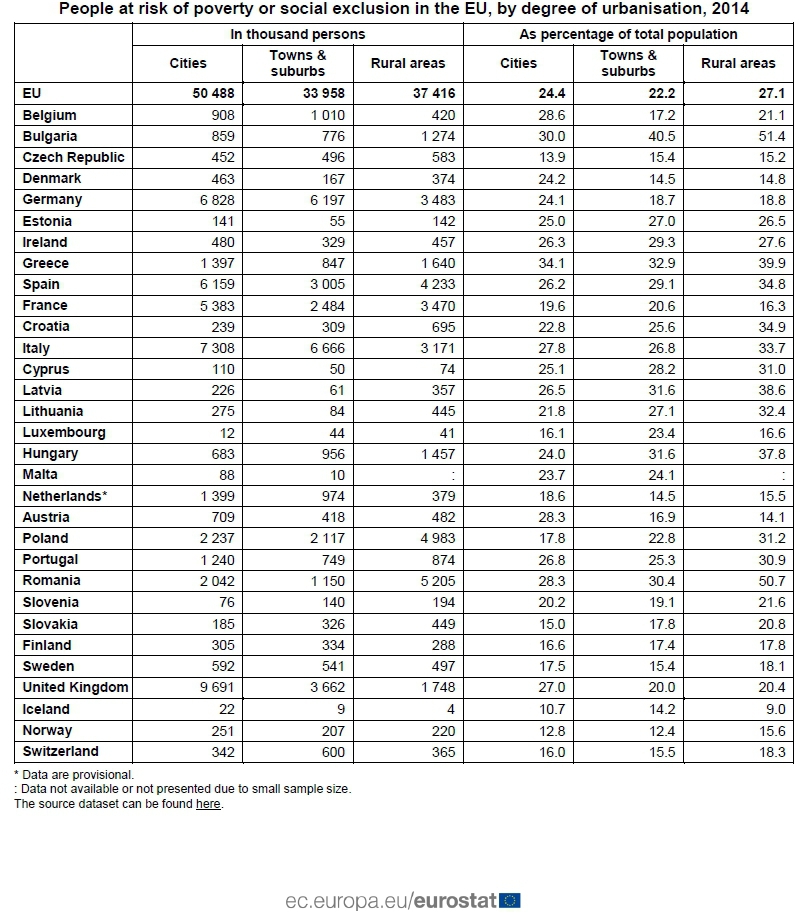 Страната ни се откроява по още един показател - риск от бедност и социално изключване според нивото на урбанизация от 2014 г. В целия ЕС такава опасност грози около 50 млн. граждани, или близо 1/4 от градското население